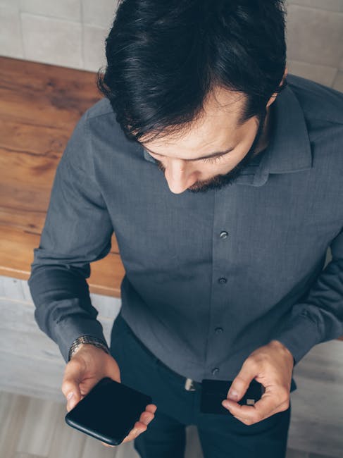 A man in a hoodie using a smartphone, surrounded by tech gear in a dimly lit room.